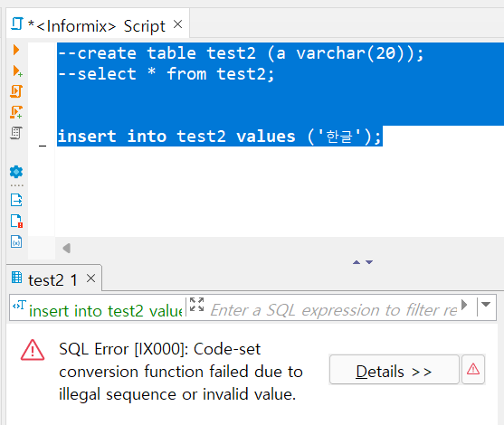 데이터베이스에 한글 데이터 INSERT 문장을 실행하면 오류메시지(Code-set conversion function failed due to an illegal sequence or invalid value.)가 발생합니다.